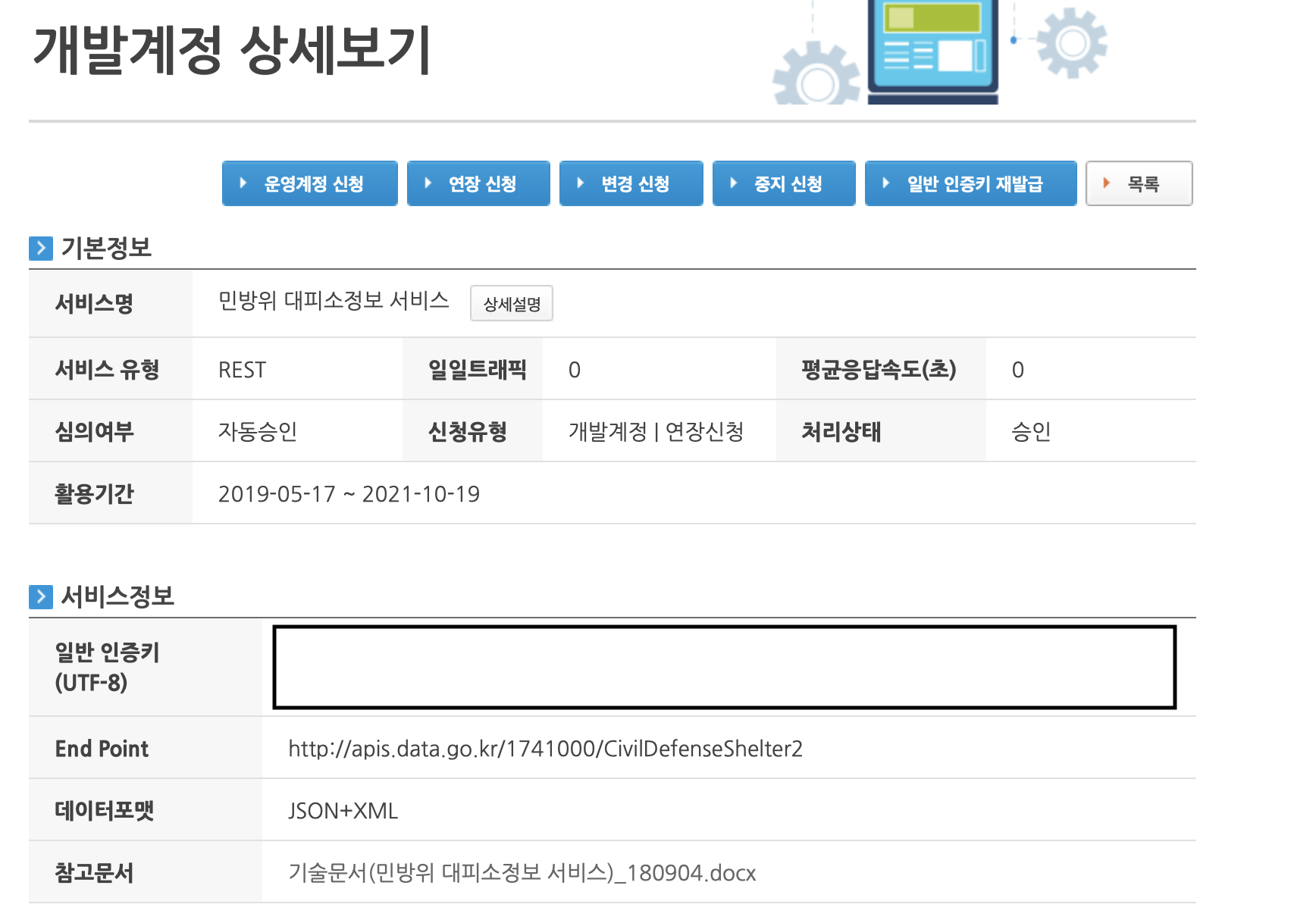 우선 공공데이터는 공공데이터포털에 접속하여 신청하고, 마이페이지에서 APP KEY등 기술 문서등을 확인 할 수 있다.
