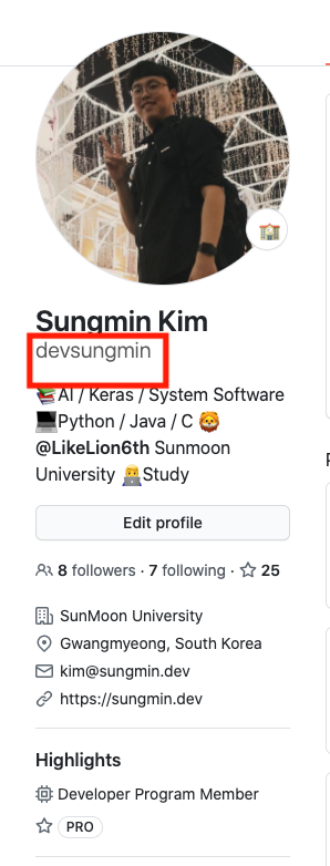 1. 가장 먼저 위에 있는 사진에 표시돼 있는 곳을 확인하여 자신의 GitHub계정명을 확인한다.