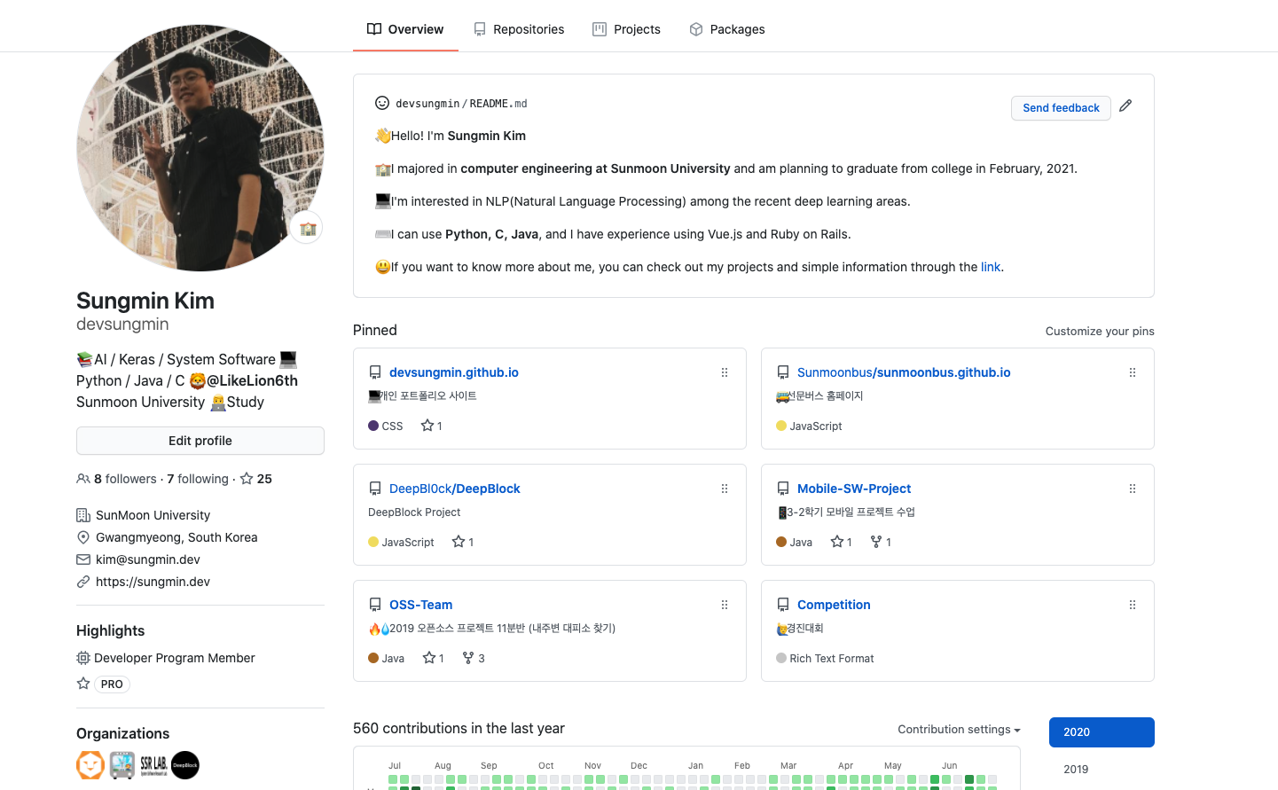 하지만 자신의 GitHub계정 이름과 같은 Repositories을 만들어 README.md을 작성하게 되면 README에 작성한 내용들이 위의 사진처럼 메인에 나오게 된다.