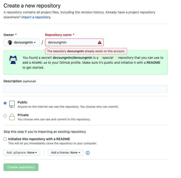 2. Repositories을 생성하기 위해 새로운 Repositories을 생성하는 페이지로 이동하고, Repositories이름을 자신의 계정명으로 작성한다.